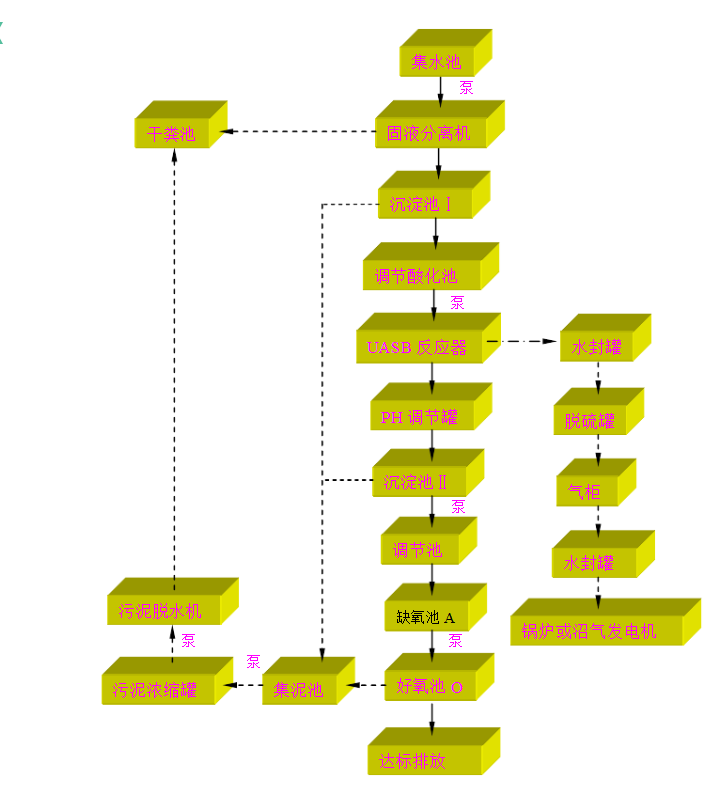 废水经脉冲补水器进入UASB反应器进行厌氧反应,大量去除废水的COD、BOD,将其转化为沼气。UASB反应器的出水进入絮凝反应罐,产生的沼气则经过水封罐,再经过脱硫罐和水封罐进入气柜贮存。沼气通过沼气发电机进行发电,供给废水处理系统用电。